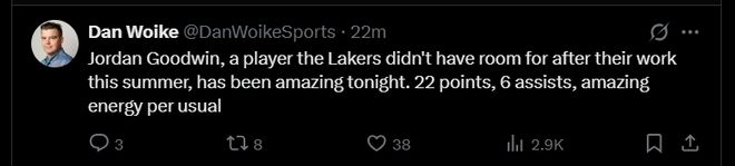 比赛过程中,湖记Dan Woike发表评论:“乔丹·古德温,这位湖人队今夏重组后无处容身的老将,今晚表现惊艳。22分6助攻,一如既往地充满活力。”