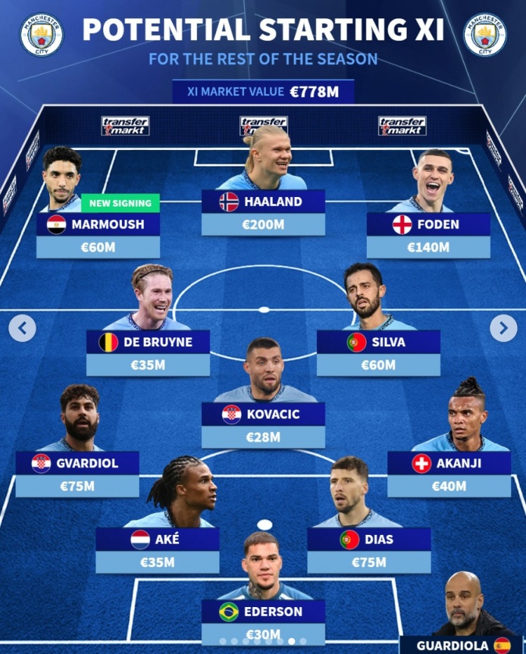 2月15日讯 曼城在今年冬窗引进4名新援,《转会市场》也预测了他们在下半程赛季的首发阵容情况。德转预测曼城下半程首发阵:总身价7.78亿欧元前锋:马尔穆什(6000万)、哈兰德(2亿)、福登(1.4亿)中场:德布劳内(3500万)、科瓦西奇(2800万)、B席(6000万)后卫:格瓦迪奥尔(7500万)、阿克(3500万)、鲁本-迪亚斯(7500万)、阿坎吉(4000万)门将:埃德森(3000万) 本文标签: 足球 英超 曼城