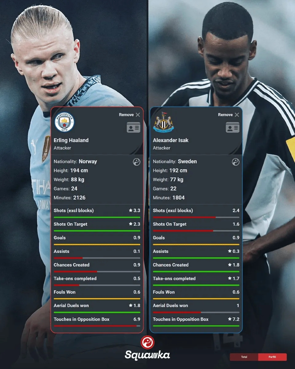 2月15日讯 本周英超第25轮,曼城主场对阵纽卡。Squawka对比了哈兰德和伊萨克本赛季英超的数据。